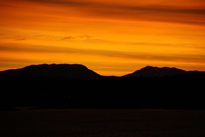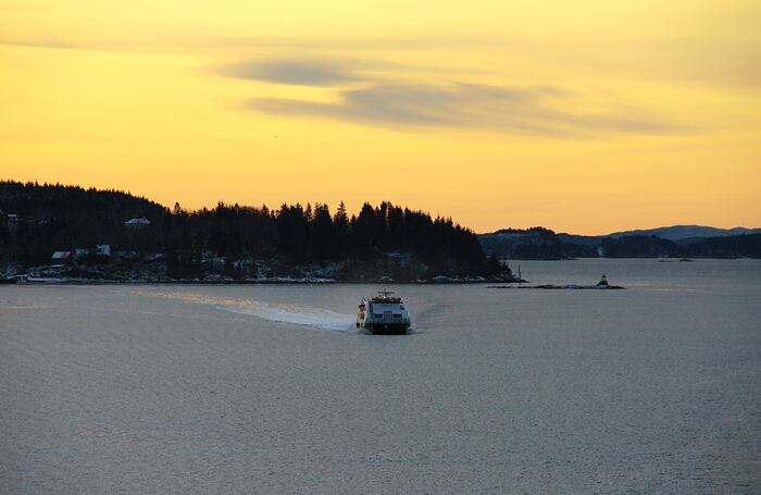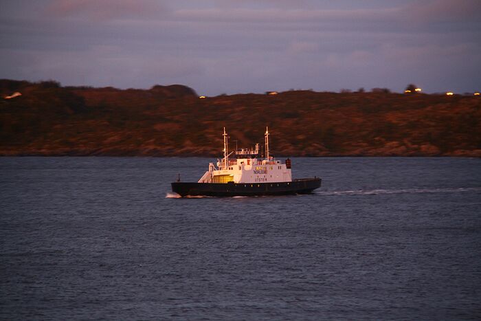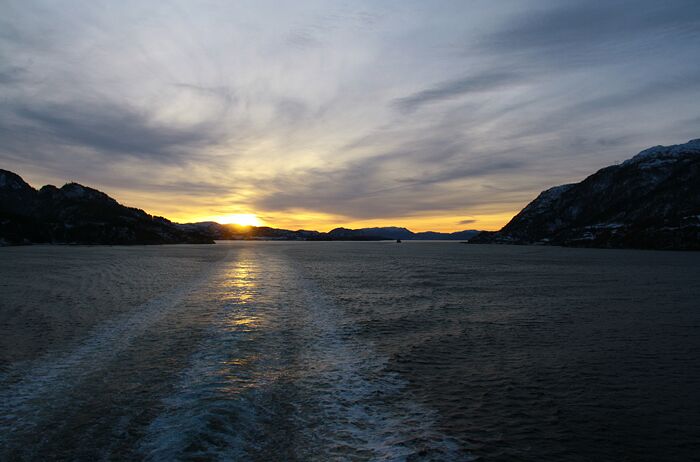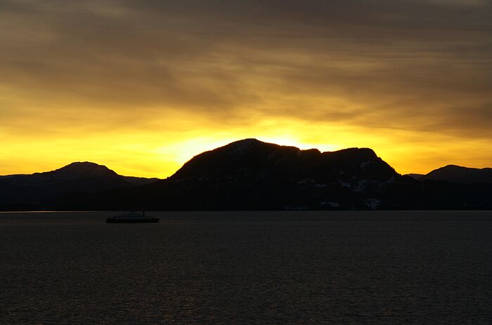 Solen gömde sig bakom bergen, och i motljuset syns ännu en av alla bilfärjor som går i de norska fjordarna.