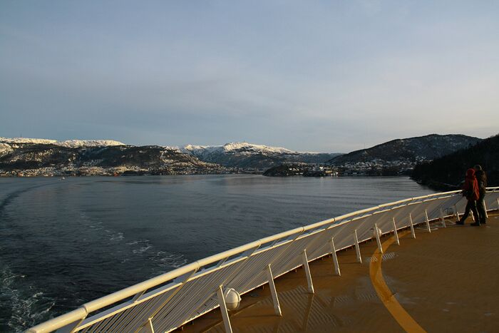 Strax före halv två lämmnade Stavangerfjord hamnen i Bergen. I solljus stävade vi tillbaka genom de vackra farvatten vi beskådat på morgonen och förmiddagen.