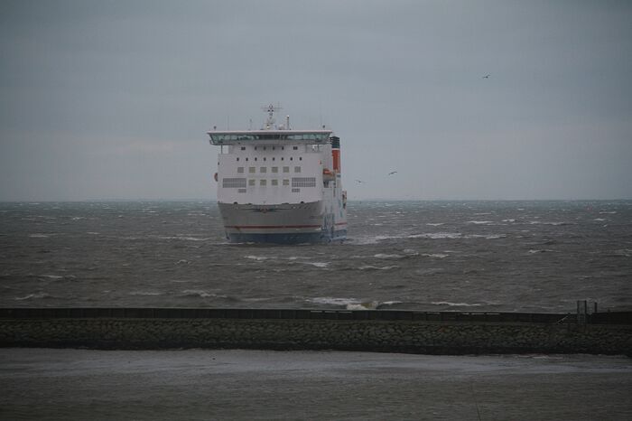 Färjan från Göteborg var i hamn till 11:30. Avgången 11:50 blev sedan lite försenad då det dels tog lite tid att lägga till i den hårda vinden, men framför allt att man utförde ID-kontroller i terminalen inför ombordstigning. Två vakter från Securitas som skulle kolla det hundratalet passagerare.