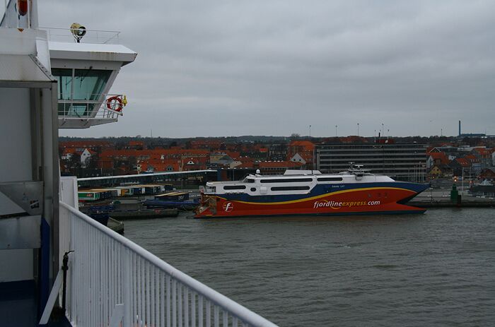 En sista skymt av Fjord Line under denna resa. Katamaranen Fjord Cat som under sommarhalvåret kör mellan Hirtshals i Danmark och Kristiansand i Norge, men som under vintern ligger upplagd i Frederikshavn.