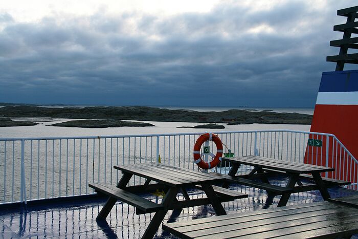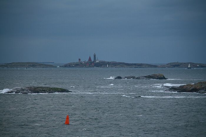Överfarten från Danmark till Sverige blev absolut ingen upphetsande historia. Rätt fullt med passagerare ombord så det fanns knappt några sittplatser alls, om man nu inte satt på golvet i trapphuset vilket ju tillhör första klass standard…Köpte lite godis i butiken ombord samt så vi tog vi en fika ståendes men annars hände inte mycket innan Göteborgs skärgård närmade sig, vilket var en lättnad…Här på bild syns Vinga och dess fyr.