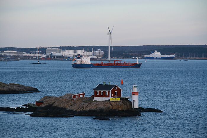 Gäveskär med dess agafyr i förgrunden. I bakgrunden syns hamn och industriområdet Arendal på Hisingen.