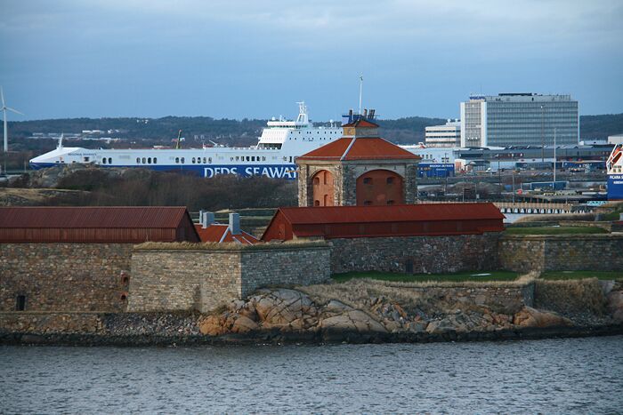 Nya Älvsborg fästning är en kontrast till Älvsborgshamnen i bakgrunden.