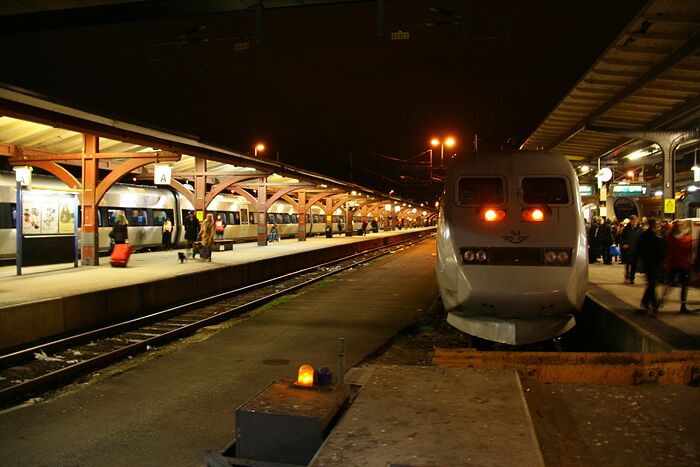 18:30 kom tåget (SJ Snabbtåg) till huvudstaden att gå. På grund av ett dörrfel på en av vagnarna så kom tåget ganska sent in till Göteborg, men efter ett kort uppehåll så kom tåget i alla fall iväg i skaplig tid mot Stockholm. I huvudstaden var vi framme, efter en mycket bevkäm resa med X2000, några minuter efter halv tio. Sedan hade jag en väldans tur att hinna med ”rätt” tunnelbana till Ropsten som passade in buss 203 väldans bra.
