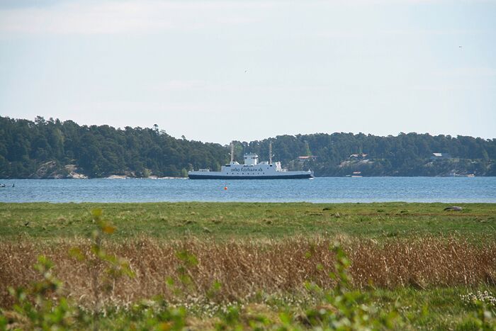 En blick över strandängarna och så fick jag syn på Ornöfärjan Ebba som trafikerar Dalarö – Hässelmara.