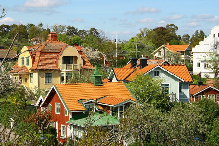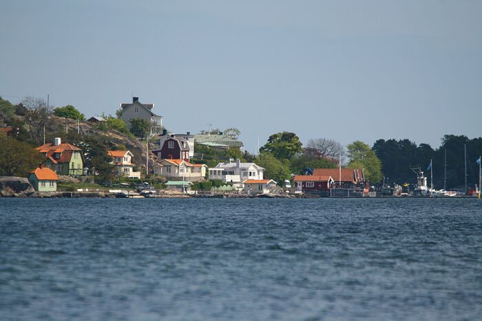 Dalaröbebyggelse, många fina hus finns att skåda. Till höger syns en del av det tjusiga Dalarö Hotell Bellevue, som innehar både hotell och festvåningsverksamhet.