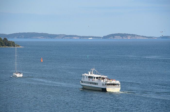 Blidösundsbolagets Sjöbris på norrgående, hade passerat Dalarö på en av Skärgårdsstiftelsens vänresor som denna vår gick till Huvudskär. Hör från Lotsberget att skepparen observerar passagerarna om att två örnar kunde ses på styrbords sida. Och visst svävade två örnar över Genböte. Längre bort i bild över Jungfrufjärden syns en annan skärgårdsbåt, Roslagen, vid Mörtö i Nämdöarkipelagen.