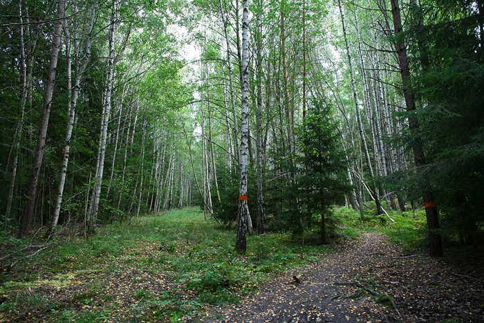 En stor del av söndagens vandring gick längs Upplandsleden, en sydlig variant på vandringsleden ska väl tilläggas. Den huvudsakliga Upplandsleden utgår från Sunnersta i utkanten av studentstaden Uppsala. I alla fall så ger dessa orangea markeringar på träd, stenar och andra föremål en fin orienteringshjälp genom skog och mark.
