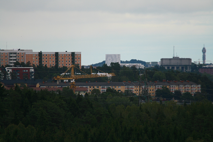Här är det lite att lokalisera på denna bld. Den vita fyrkanten längre bort i bild ligger i alla fall rätt nära en ”mallig” galleria i Solna. Till höger syns ett speciellt torn på Djurgården, syns från lite varstans i staden, bland annat från min balkong. 😉