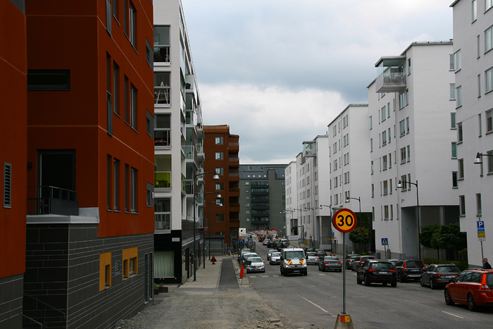 Tunnelbanan tog jag till Alvik, satte mig på spårvagn 22 mot Solna station, steg av vid Sundbybergs centrum och påbörjade där en långpromenad in till stan. Sundbyberg är en av kommunerna där mycket bostäder har byggts de senaste åren och resultatet av det var jag lite intresserad av se. Gick en bit ner på denna gata kallad Hamngatan, vad som är hamn på bilden kan man ju fråga sig, men husen till höger i bild ligger i alla fall precis intill Bällstaån.