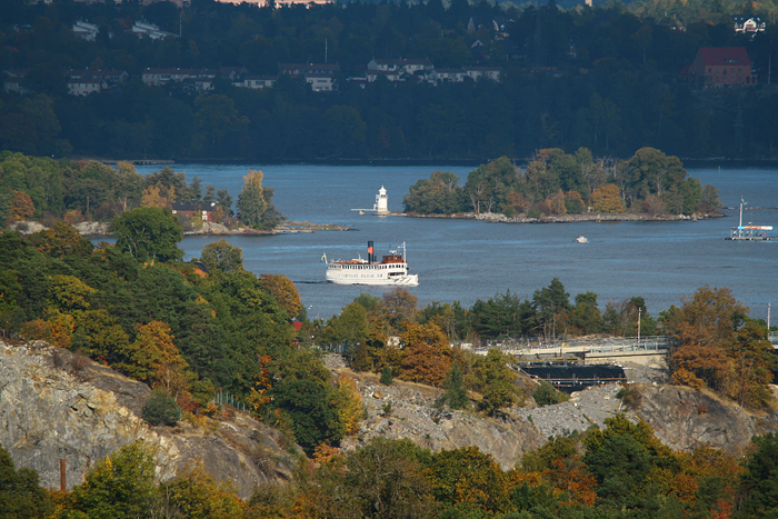 Med vy mot Kvarnholmen och Lidingö där på avstånd Strömma Kanalbolagets Gustafsberg VII från 1912 syntes utanför Fjäderholmarna.