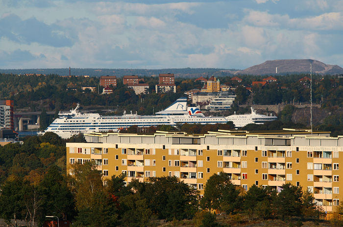 Rätt dålig kurragömma från Silja Symphonys sida. 😉 Husen i förgrunden med den enligt min åsikt kraftigt diskutabla färgen ligger på Henriksdalsberget. Bakom färjorna vid Värtahamnen så syns Torsvik och Foresta på Lidingö, där även konstmuseet Millesgården ligger.