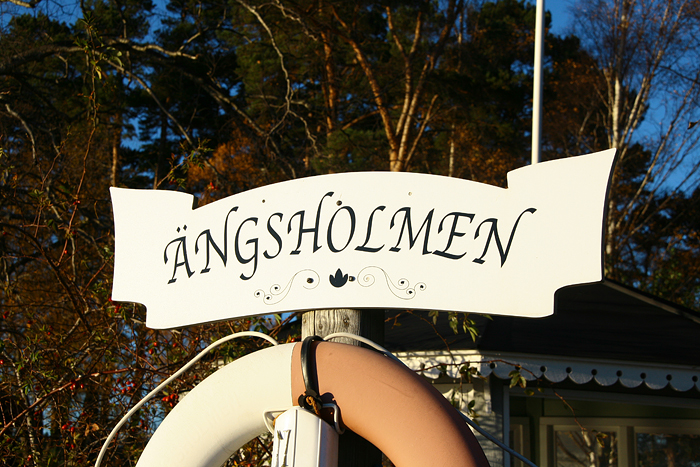 Nämdös sydligaste spets är Ängsholmen och där finns bland annat en ångbåtsbrygga med trevligt lusthus och en vacker bryggskylt inte minst. Från just denna brygga kom vi att stiga på Roslagen igen för återfärd till Saltsjöbaden.