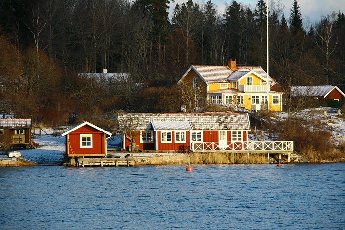 Röd och gul bebyggelse på Vettersö vars brygga fanns med i tidtabellen för denna dagstur, dock inga intresserade att att stiga av eller på.