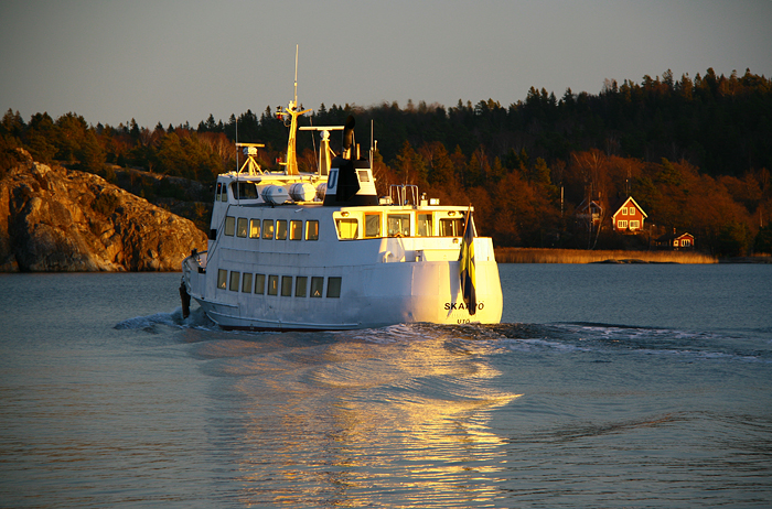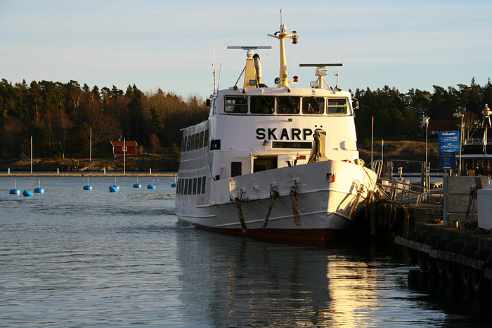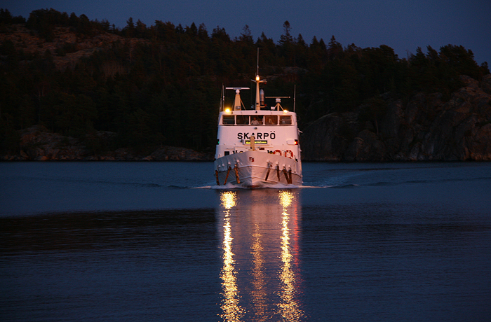 När klockan närmade sig halv fyra var det dags att stiga ombord Skarpö igen och åka tillbaka till Nynäshamn. Mörkret började ju falla så det var ingen nackdel att resa hemåt.