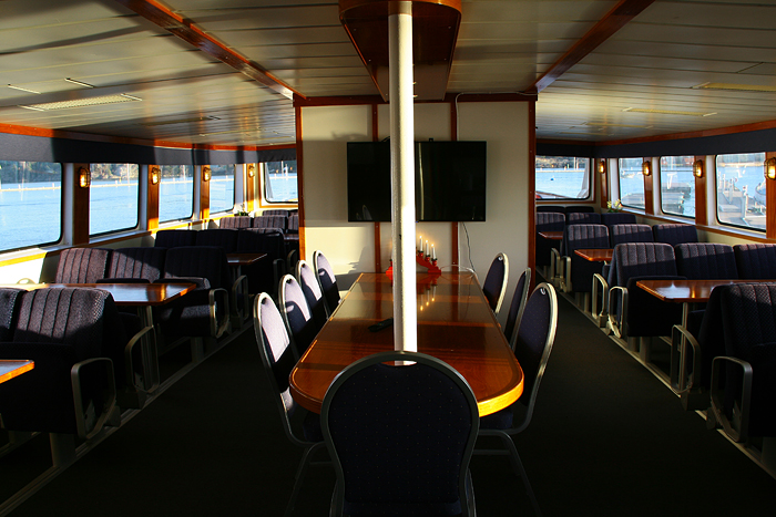 Övre salongen på denna skärgårdsbåtsklassiker Skarpö som är byggd 1965 och har tjänat många år i Stockholms skärgård. Ägs numera av Utö Rederi som dock kör för Waxholmsbolaget.