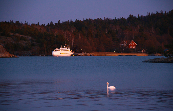 En ensam svan på simtur i Rånösundet, på andra sidan sundet ligger Skarpö vid bryggan Ålö. Från Ålö finns vägförbindelse med Utö, dock en rätt bra bit att gå från Ålö till Gruvbyn som man kan kalla för Utös centrum.