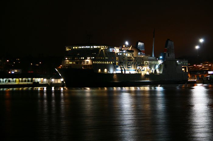 Här i mörket vid Nynäshamn låg Polenfärjan Wavel inne, fartyget har en exteriör som gör att den ser bäst ut i mörker eller dimma. Skärgårdsturen närmade sig i alla fall sitt slut och halv fem var man iland på fastlandet igen.