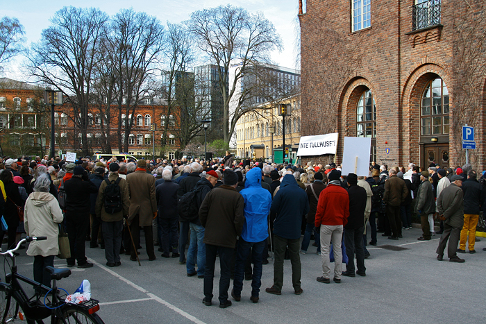 Så var det dags att demonstrera! Vid Stadshuset den 18 april visades ett stort motstånd åt planerna på att bygga ett Nobel Center på Blasieholmen i centrala Stockholm. Politiker från partierna S, M och C tog dock ingen notis om detta motstånd förstås och klubbade igenom det hela i kommunfullmäktige där det blev en rätt klar majoritet som röstade för trippla gigantiska lasagneformar i den gamla hamnmiljön så centralt i staden.