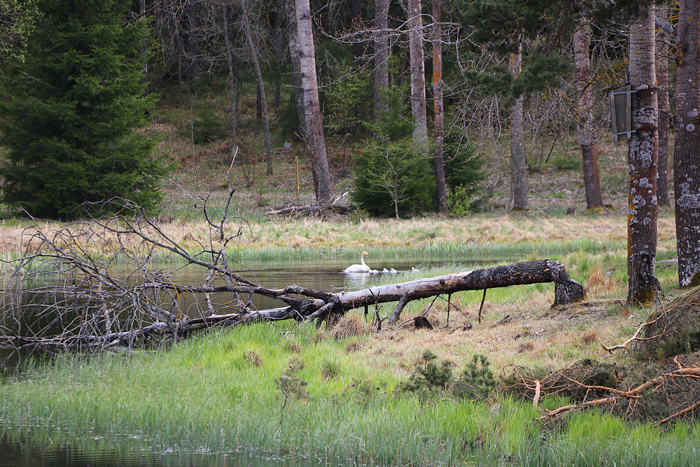 Efter att gått över Ekholmsnäsvägen så gick jag in i de vackra markerna mot Långängen, och även då in i Långängen-Elfviks naturreservat vilket är ett av två naturreservat på Lidingö. Kappsta är det andra och är ett mindre område som ligger mellan AGA och Högberga vid vattnet. På bilden syns en del av Västra Långängskärret eller alternativt namn Långängssjön, där bland annat sångsvanen häckar. Och visst såg jag familjen Svan ute.