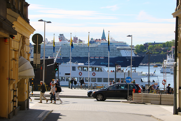 Sjögull embarkerade vi vid Strömkajen strax efter halv elva. Avgång mot Ängsö kl. 10:45. På Strömmen låg denna torsdag kryssningsfartyget Mein Schiff 3.