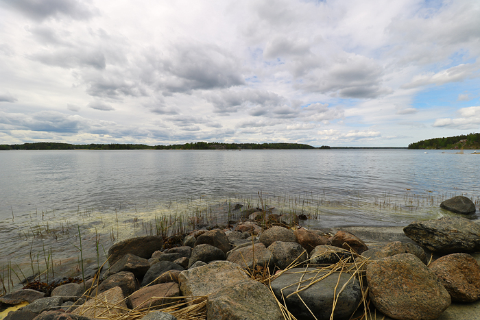 Vidvinkelbild från strandkanten mot nordväst. En ö i den nära omgivningen bär det festliga namnet Pannkakan, och ligger närmare Gärdsnäs på fastlandet.