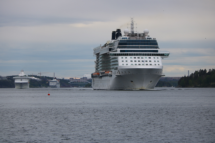Innan vi nådde stan vid sjutiden så kunde jag och min sjöfartsintresserade vän Kim fotografera lite kryssningsfartyg på utgående, när vi på Sjöbris var i höjd med Ormingelandet och Lidingö. Här på bilden kommer den stora Celebrity Eclipse, som mäter hela 317 meter på längden.