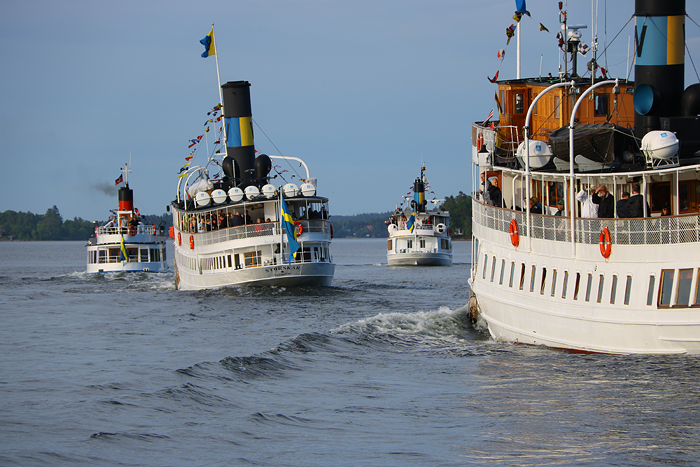 Kortegen ut till Vaxholm brukar vara en rätt långdragen historia med rätt stora avstånd mellan båtarna. I år gick det dock annorlunda till, då båtarna under utresan växlade plats med varandra ända fram till bortåt Vaxholm. Alla fem båtar fick ha ledarrollen och det kom att utväxlas en hel del hälsningar mellan fartygen. På bilden leder Västan kortegen, och det är ju klart att den båten är nummer ett. 😉 Följs av Angantyr, Storskär och Norrskär.