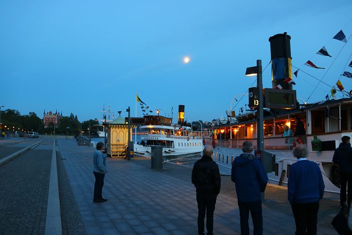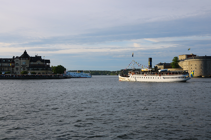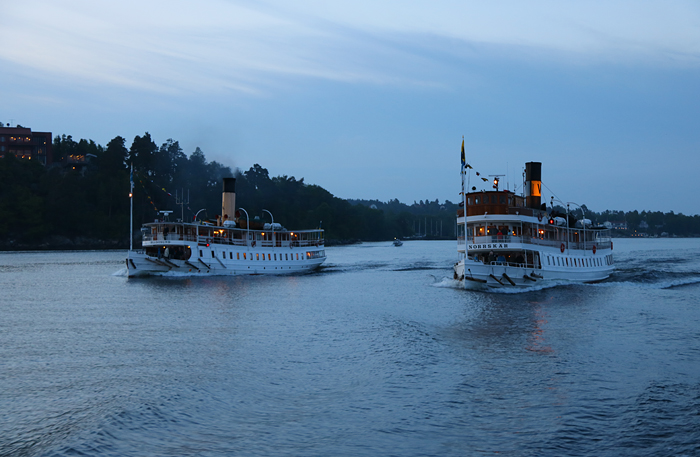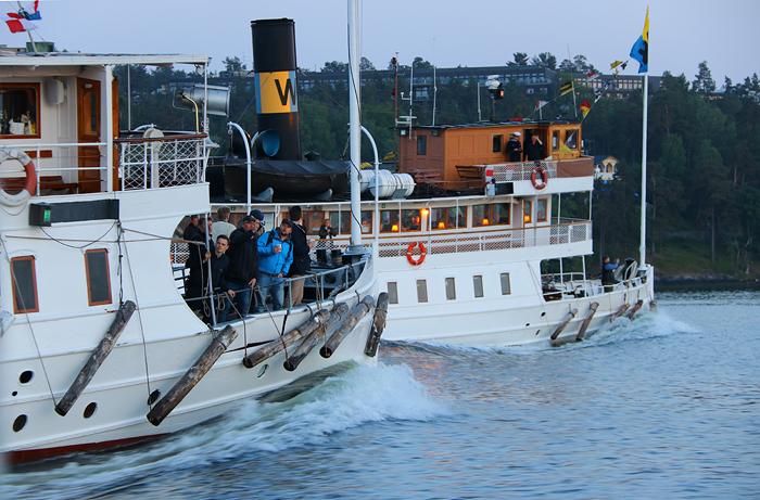 Tids nog så är det avgångstid igen, när solen börjar gå ner. Gäller att gå ombord lite tidigare om man vill få plats då man på hemresan får välja fartyg fritt. Jag valde då snabbångaren Storskär, som har fartresurser upp till 13 knop. På hemvägen gick ångfartygen lite för sig själva, medan motorfartygen låg en bit efter. Västan avgick som sista fartyg 21:45 från Vaxholm, övriga lämnade 21:30. Ejdern och Örnen började hemfärden ännu tidigare – 21:00.