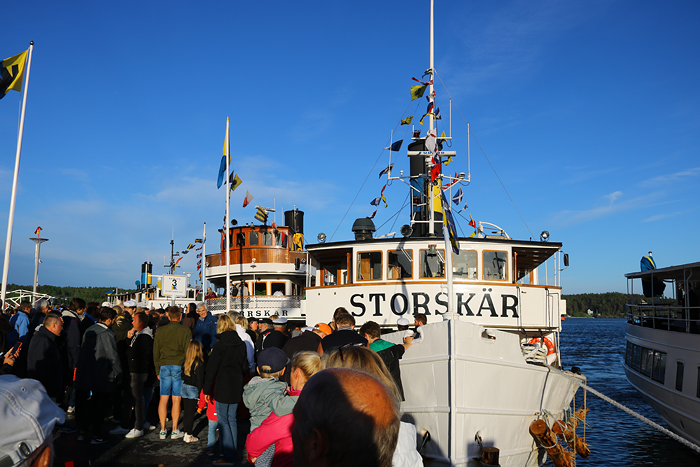 Storskär låg inte först under hela resan ut, men i Tenösundet när Vaxholm närmade sig så var skönheten byggd 1908 i täten igen. Ja denna kväll deltog ju bara skönheter förresten. 😉 En fascinerande syn är folkmängden på kajen i Vaxholm.