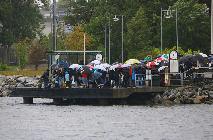På Gåshaga brygga kom jag knappt fram till båten Sjöbris, då paraplymaffian stod ivägen. 😉 Skämt åsido så var vädret verkligen uselt på morgonen och förmiddagen. Folkmassan på bryggan skulle de flesta av dem åka ut till Husarö, dit det gick förstärkningsbåt denna söndag. Detta beroende av ett konfirmationsläger på Husarö dit förmodligen de anhöriga till konfirmanderna skulle ut denna dag.