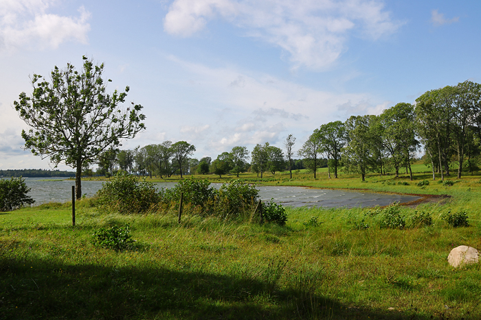 Den vackra vyn visar en del av Lidös öppnare landskap. Bakom lövträden vid strandkanten så breder sig en rätt stor del hagmark ut.