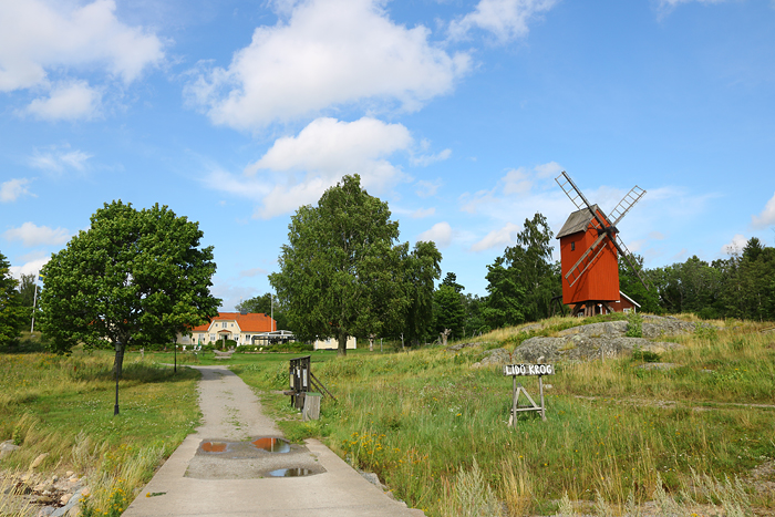 Inte alla öar som har väderkvarnar. På Lidö står väderkvarnen nere vid ångbåtsbryggan som faktiskt har tillägg med ångbåt under sommaren. S/S Blidösund kan göra tillägg här vid Lidö på sin kvällstur till Norrtälje – förvisso som är slut för säsongen nu…Den ljusa byggnaden som syns är Lidö värdshus – ett gammalt säteri.