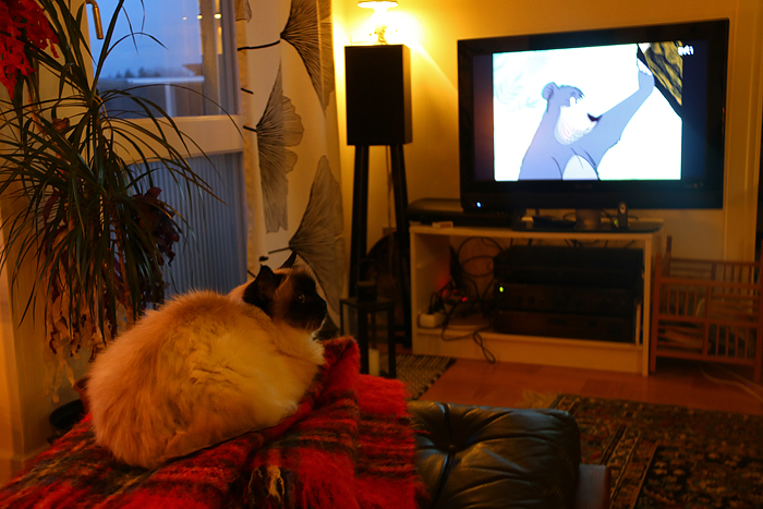 Skrev ju att björnarna är i ide, och det är de ju. Dock ej på televisionen där djungelbjörnen Baloo som vanligt underhöll i Kalle Anka och hans vänner. En tradition att se dessa tecknade filmsekvenser såklart! Och även katten verkade uppskatta den typen av TV-program. 😉