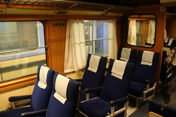 Tågbyte i Göteborg, om än lite mindre bytestid – den här gången bara en dryg halvtimme och då behövdes det inte ske några fall utanför Göteborgsoperan inte. 😉 Säkrast att vara kvar på Centralstationen tills dess att Gröna tåget rullade in för avgång 17:55. Vi kom alltså inte att åka med SJ till Stockholm utan provade detta privata alternativ med bra pris – 200 spänn kostade resan upp till Stockholm. Och om ni undrar varför jag skrev Gröna tåget när vagnen på bilden är blå – så var det så att vi kom att få åka med tågets enda blå vagn. 😉