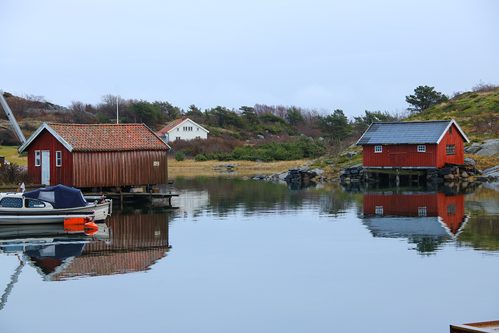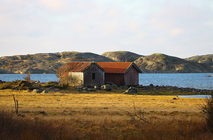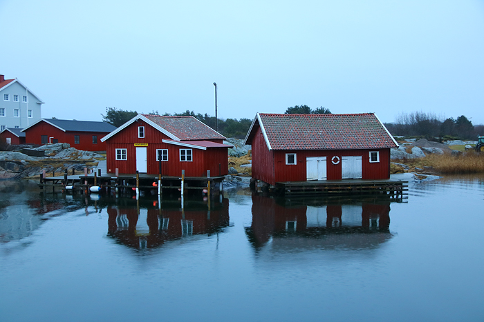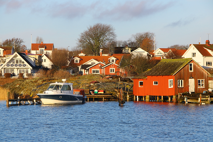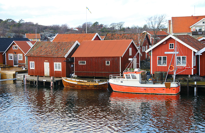 Röda stugor och brygghus matchas väl med Koster Marins röda fartyg.