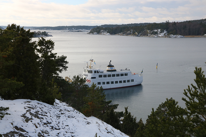 Här lämnar Hemfjord Simpnäs och ska gå över till Arholma igen, restiden däremellan är på 15 minuter. Vår hemresa från Simpnäs på Björkö hade kunnat gå smidigare, eftersom bussen på linje 636 fick tekniska problem och ställdes in så blev vi stående i snöfallet i denna by på landsbygden. Fyra timmar till nästa buss…Nej alternativet var bara att ringa efter en taxi. Lokala Väddö bilstation kom vi fram till och det kom till slut en taxibil o hämtade upp oss. Väldans trevlig chaufför som guidade oss upp till Älmsta. Taxinotan på ca 500 spänn tog Kim för att naturligtvis skicka vidare till SL. Från Älmsta kunde vi sedan åka hem utan problem.