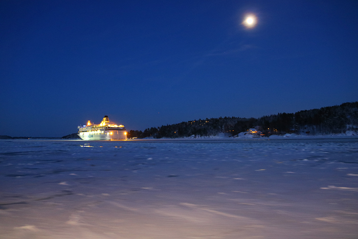 Månsken över Halvkakssundet som går mellan Lidingö och Ormingelandet. Färjan på bilden är Victoria I som går mellan Stockholm – Mariehamn – Tallinn. Tallinn är huvudstaden i Estland.