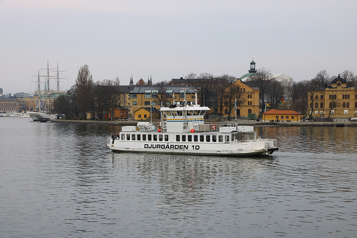 Djurgården 10 i en snart utgången färgsättning med Waxholmsbolagets gul-blå ränder då Djurgårdsfärjorna nu ska få blåa styrhytter och lite mer SL-loggor på sig.
