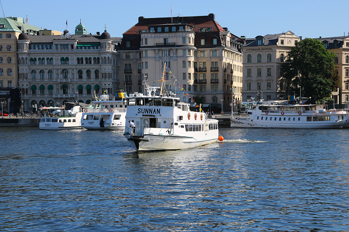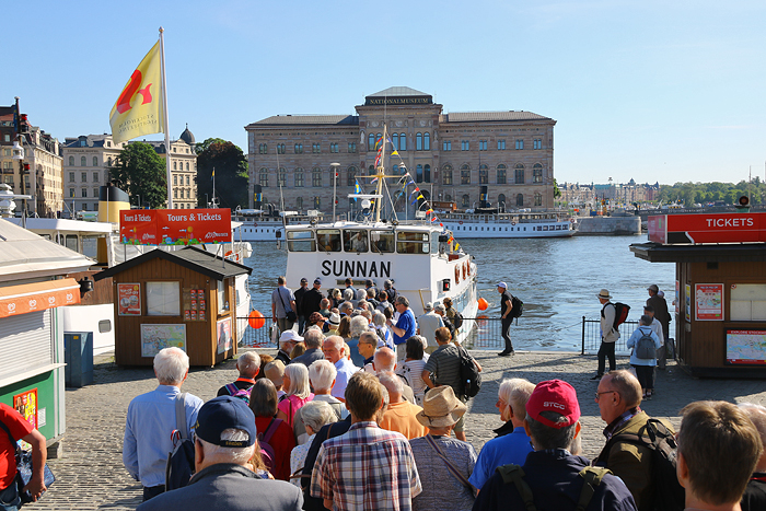 Ombordsstigning vid Skeppsbron en kvart innan avgång 09:00. Resandemängden var satt begränsad till 100, även om båtens kapacitet är det dubbla, men att trängas på en båt i sex timmar hade inte varit någon hit.