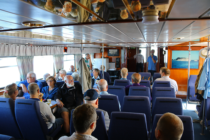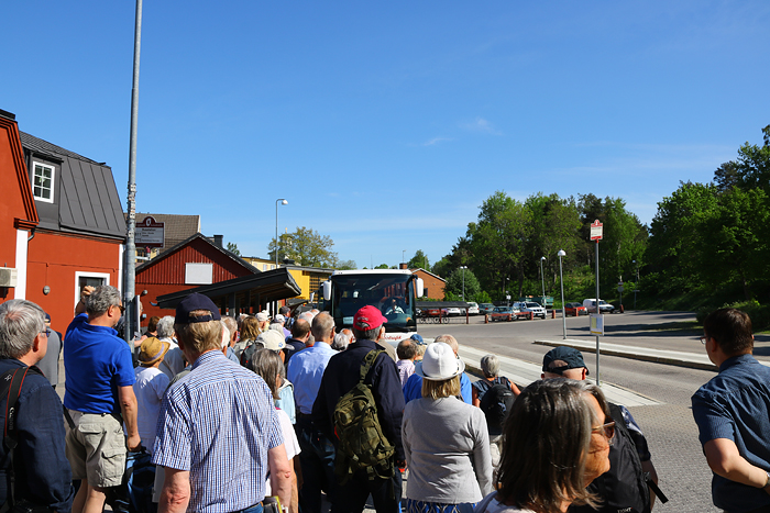 Klockan närmade sig halv fyra när vi slutligen kom fram till Östhammar – den ort som fartyget som byggdes i för 50 år sedan. En fantastiskt fin tur från centrala Stockholm upp i Roslagen var det verkligen. Tack till de som anordnade denna resa däribland fartygets tidigare ägare Hans Naess. Efter ilandstigning så var det ”bara” att leta upp bussen, där hade det blivit lite rörigt om var de nu skulle stanna och släppa på oss i orten.