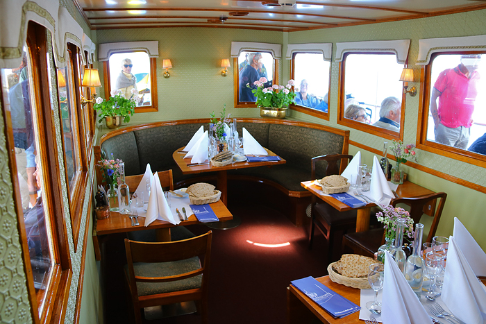 Är man på sjön en längre tid så kan ju hungern infinna sig, och vad passar då bättre än att slå sig ner i en av Blidösunds vackra matsalonger. På bilden den så kallade damsalongen på övre däck akteröver.