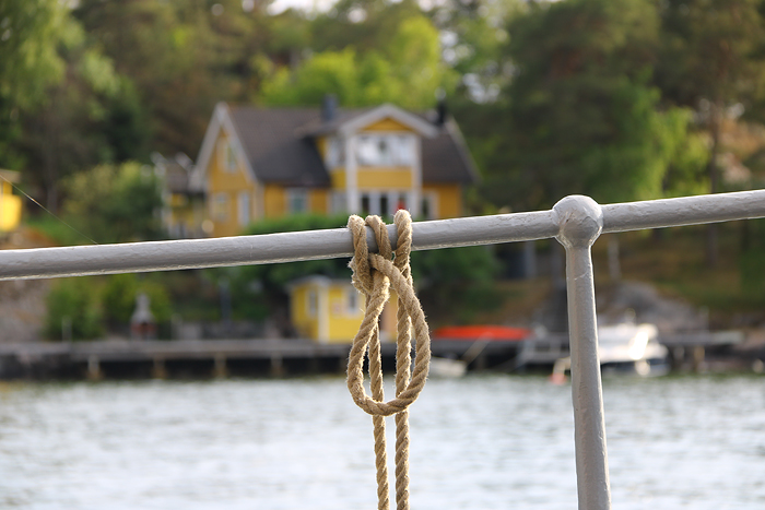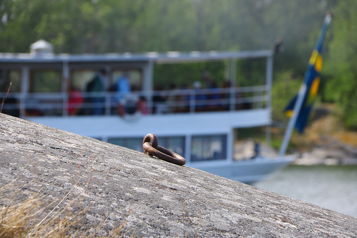 Förtöjningsring i förgrunden och en vacker ångbåt på besök i en vacker miljö i bakgrunden.