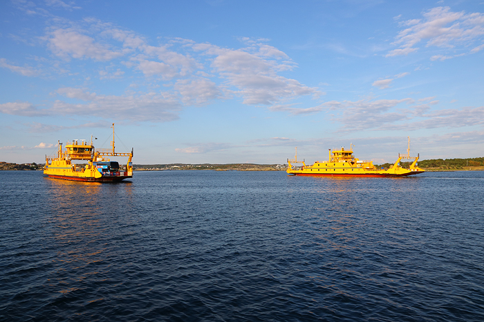 Vi passerade förbi färjeläget vid Hönö Pinan där på bilden här Ada och Beda möter varandra. På Ada står en dubbeldäckare på busslinje 290 som vi kom att åka med på torsdagen.