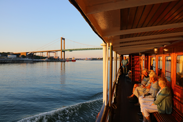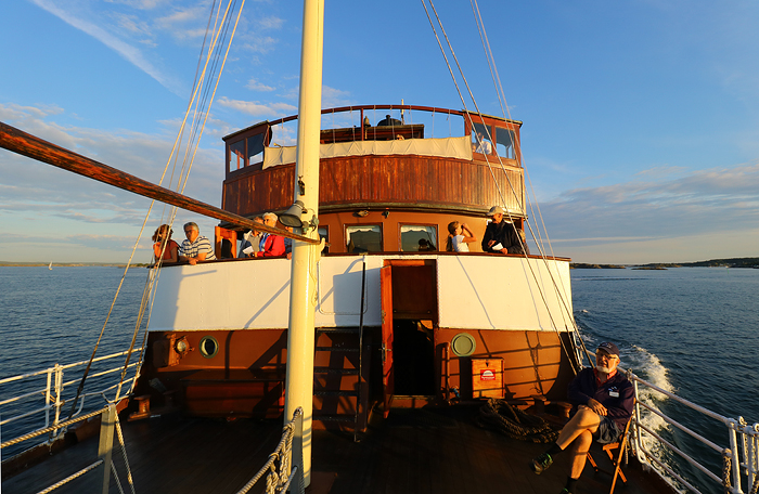 En vidvinkelbild från det underbara fördäcket på denna fantastiska ångare i en inte mindre fantastisk sommarkväll. Fartyget ägs av en ekonomisk förening medan drift och underhåll sköts av föreningen Sällskapet Ångbåten. Arbete med, kring, på och i fartyget är av ideell insats – vilken insats inte är liten! Förutom dessa kvällsturer så kör hon ett antal kustresor mot Marstrand och Lysekil bland annat, och i sommar har hon även gått in i Vänern och besökt Åmål som firat 375 år.