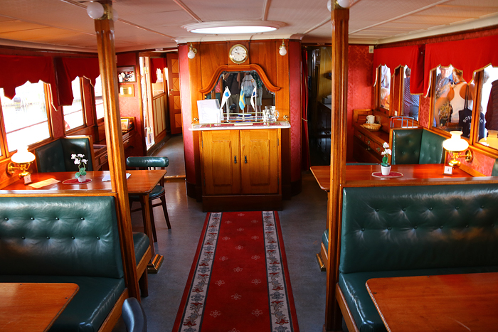 En interiörsbild från övre däck på s/s Bohuslän. Fint och välbonat ombord var det.