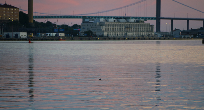 En sista bild där ett sälhuvud sticker upp i Göta älv. Flera sälar simmade omkring där under kvällen. Missade bättre fotomöjlighet på utresan, på den här bilden hade det lika gärna kunnat vara en mörk boj på grund av avståndet. 😉