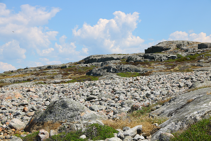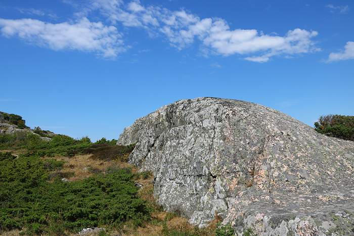 Mäktiga bergformationer på norra delen av Hyppeln. En större kluven sten med riktigt jämna sidor kunde man också beskåda närmare vattnet till.