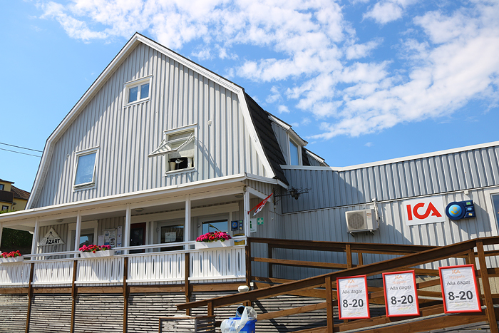 På ön finns en ICA-butik, belägen i detta hus på bilden. Vi köpte här lunch för att intaga utanför i väntan på färjan tillbaka till Hälsö senare.