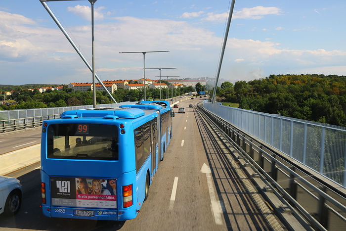 Inte så långt från 100 här, nåja linje 99 hade vi framför oss. 😉 Uppe på Älvsborgsbron kunde vi från våra platser längst fram i bussen se att det brann i ett skogsparti vid Rödastensmotet. En rökutveckling såg vi även vid en väg på Öckerö tidigare. Sommaren som var har ju varit extremt torr – och bränder som uppstått har ju varit i åtskilliga antal dessvärre.